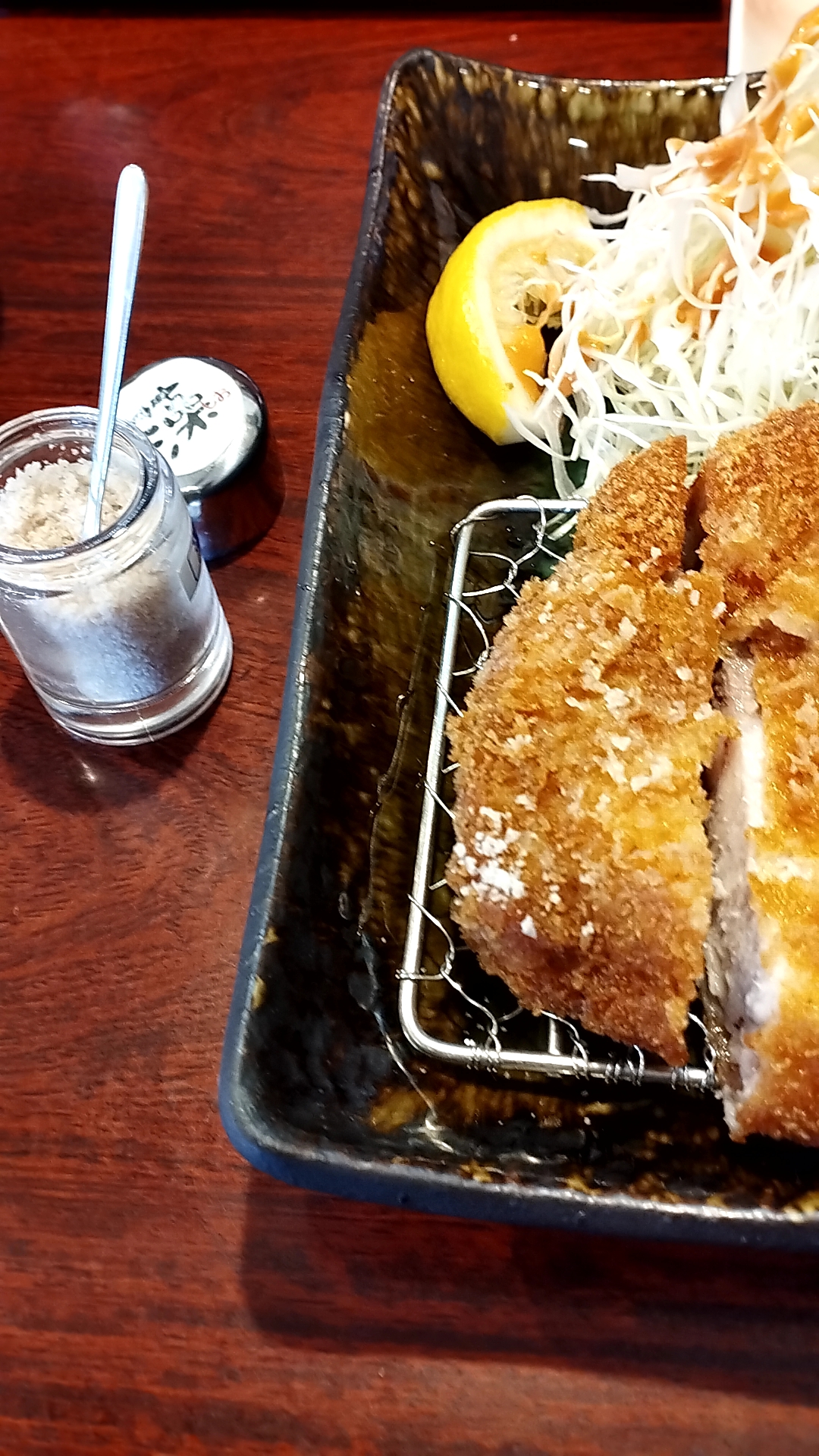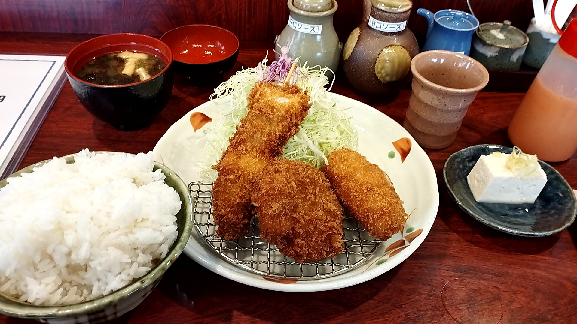 肉はかなり分厚く、それでいて非常に柔らかく、衣はサクサクでした。いや、咲々でした(ドヤァ! ← 多分元からそういう意味の店名)。ちなみにおすすめは藻塩で食べるとのこと。確かに塩で頂くと肉の風味が味わえてよいですね!もちろん塩以外にもソース各種、おろし醤油色々駆使していただきましたが、どれでも美味しくいただくことができました!