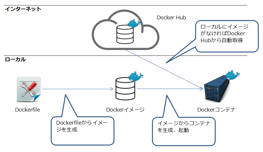 コンテナ起動時、指定したイメージがローカル(または指定場所)にない場合は自動的にDocker Hubから探してダウンロードされる。