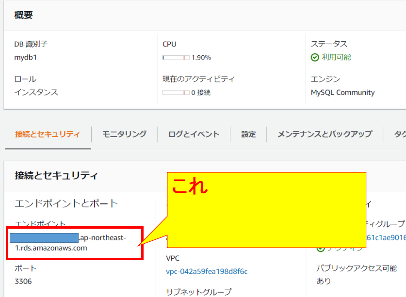 AWSのRDSダッシュボードより、接続先RDSのエンドポイントを確認してください。