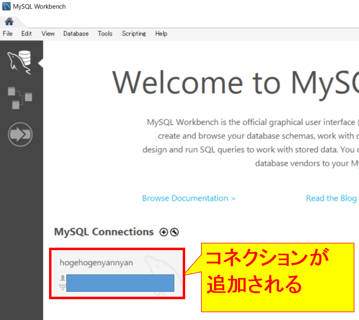 MySQL Workbenchを起動し、MySQL Connectionを追加