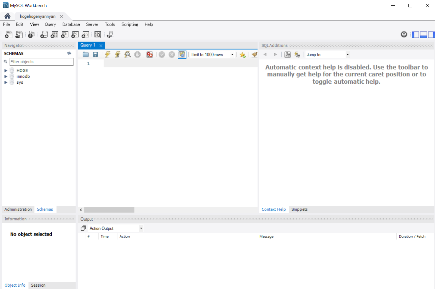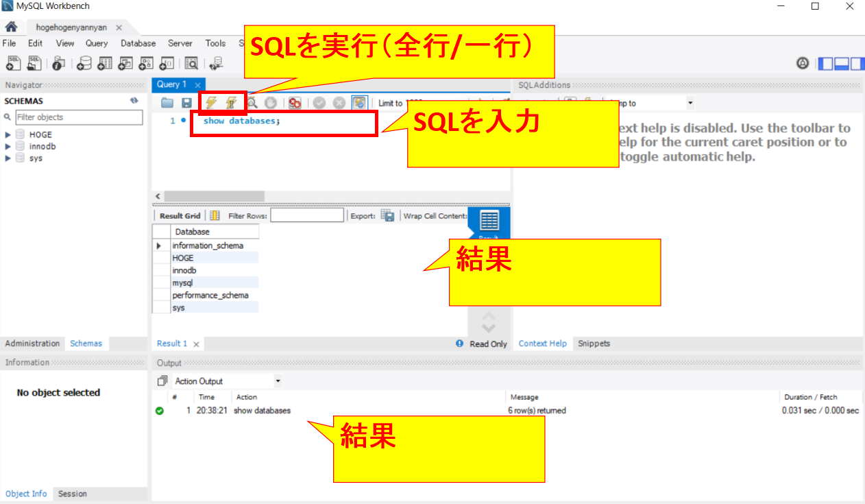 Query1タブにshow databases;と入力し、⚡マークをクリックして正常に実行されればOKです。